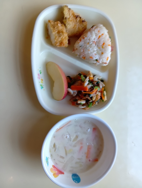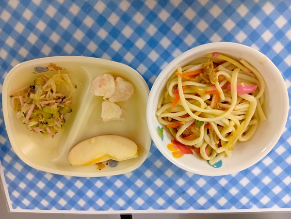 | 給食 カレーうどん 中華風サラダ たらこポテト りんご おやつ 南瓜ケーキ |