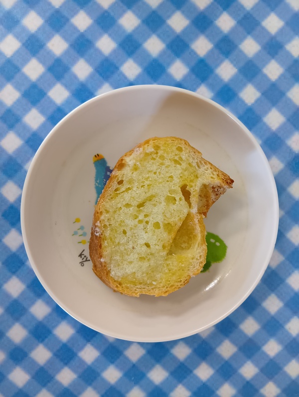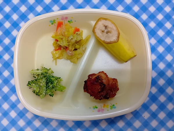 | 給食 ガーリックチキン ブロッコリーのたらこマヨ カレーソテー バナナ おやつ ラスク |