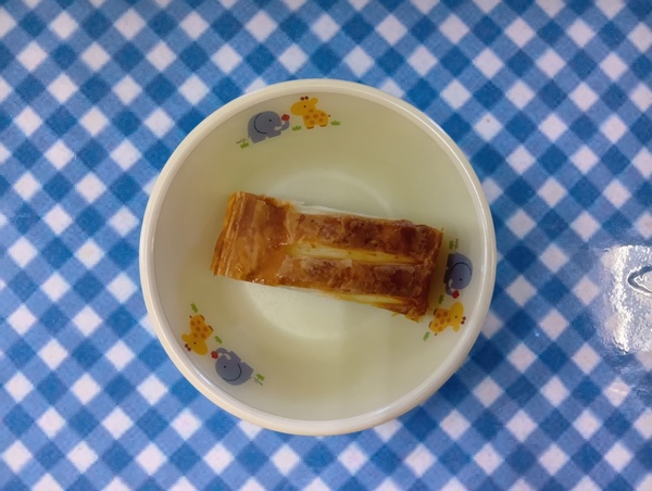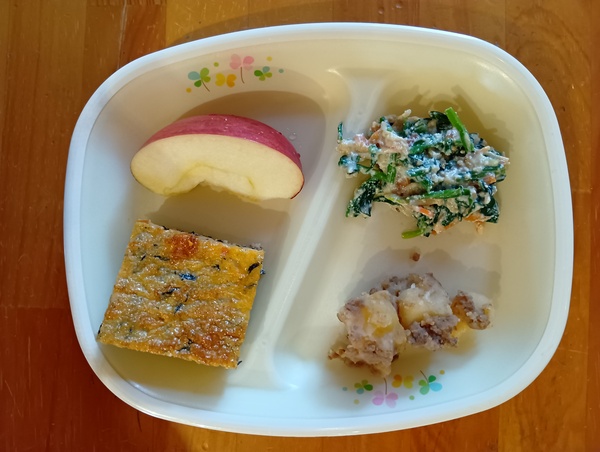 | 給食 ひじき入り厚焼き玉子 白和え じゃがいものそぼろ煮 りんご おやつ クリームデニッシュ |