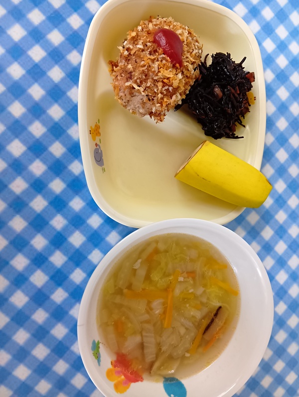 | 給食 キャベツメンチカツ あらめ煮 白菜スープ バナナ おやつ 芋みたらし |