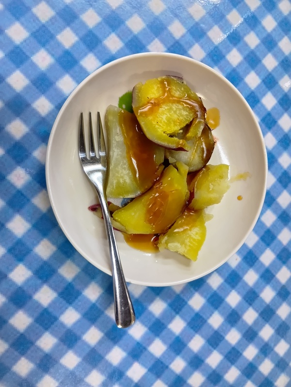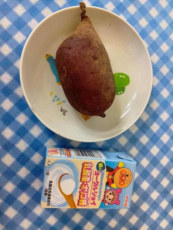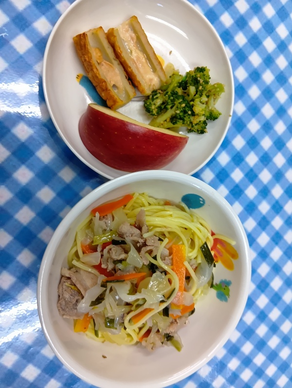 | 給食 味噌ちゃんぽん ブロッコリーの胡麻みそ和え ちくわのツナマヨ焼き りんご おやつ 焼き芋 ヨーグルトジュース |