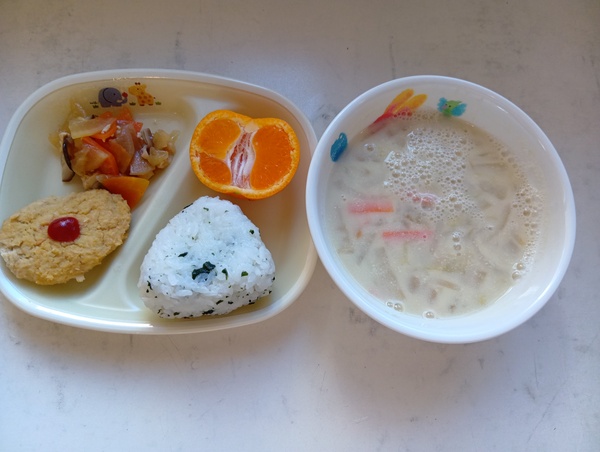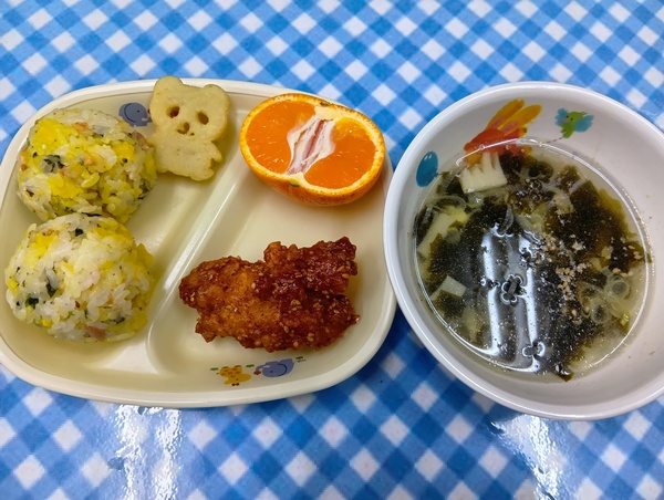 | 給食 のり塩唐揚げ ひじきのサラダ 味噌汁 オレンジ おやつ もちもちパン |