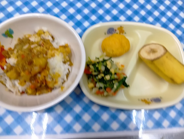 | 給食 かぶのキーマカレー ほうれん草サラダ チキンナゲット バナナ おやつ スイートポテト |