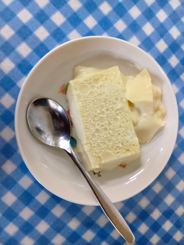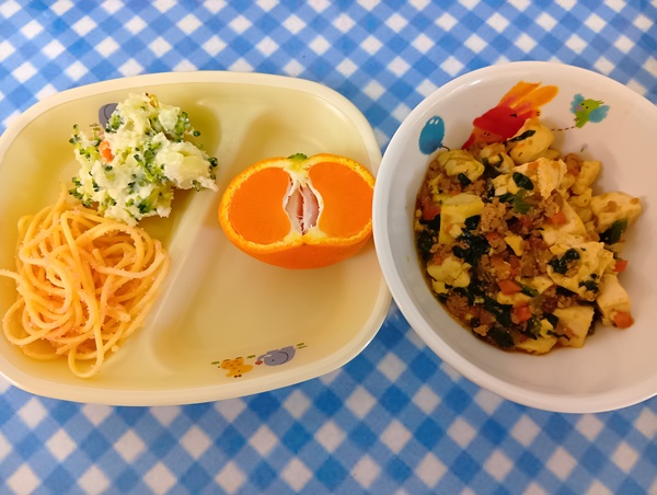 | 給食 ほうれん草入り麻婆豆腐 クリームチーズ入りポテトサラダ たらこスパゲティー みかん おやつ 豆乳ババロア |