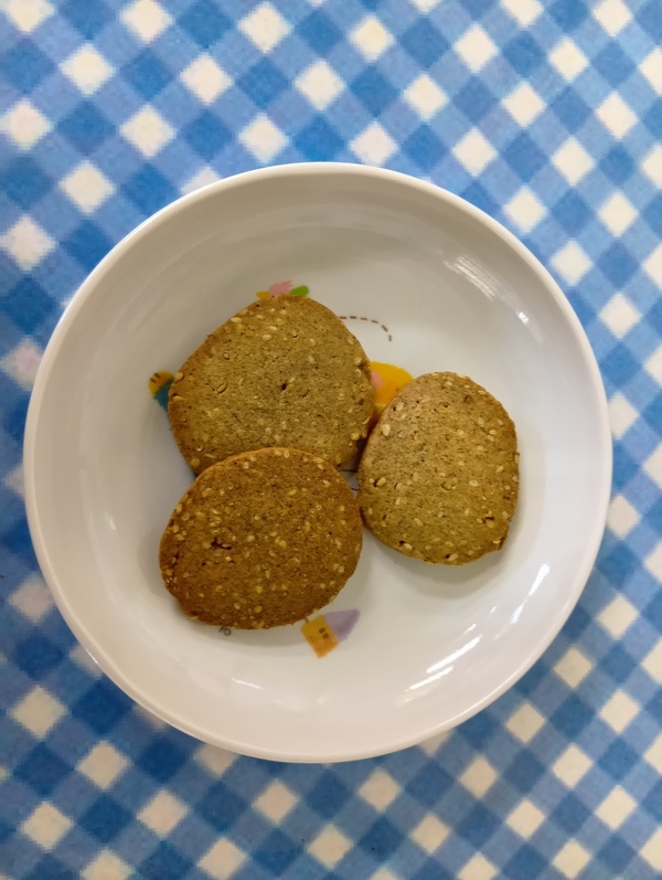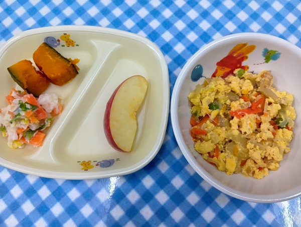 | 給食 親子煮 白菜とツナのサラダ カボチャ煮 りんご おやつ きな粉とごまのクッキー |