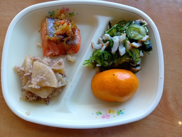 | 給食 鮭のちゃんちゃん焼き ちくわと胡瓜の酢の物 大根のそぼろ煮 みかん おやつ おからマドレーヌ |