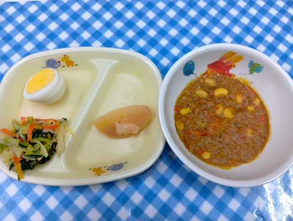 | 給食 豆カレー 中華おひたし ゆで卵 もも缶 おやつ ヨーグルト ウエハース |