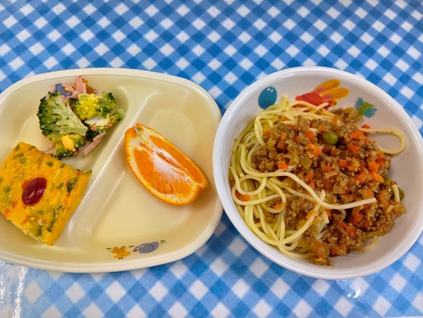 | 給食 カレーミートスパゲティー ブロッコリーのサラダ スパニッシュオレンジ はるみみかん おやつ いちごババロア |
