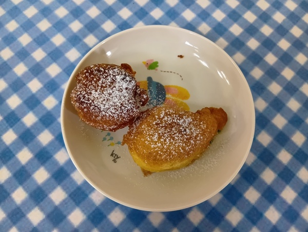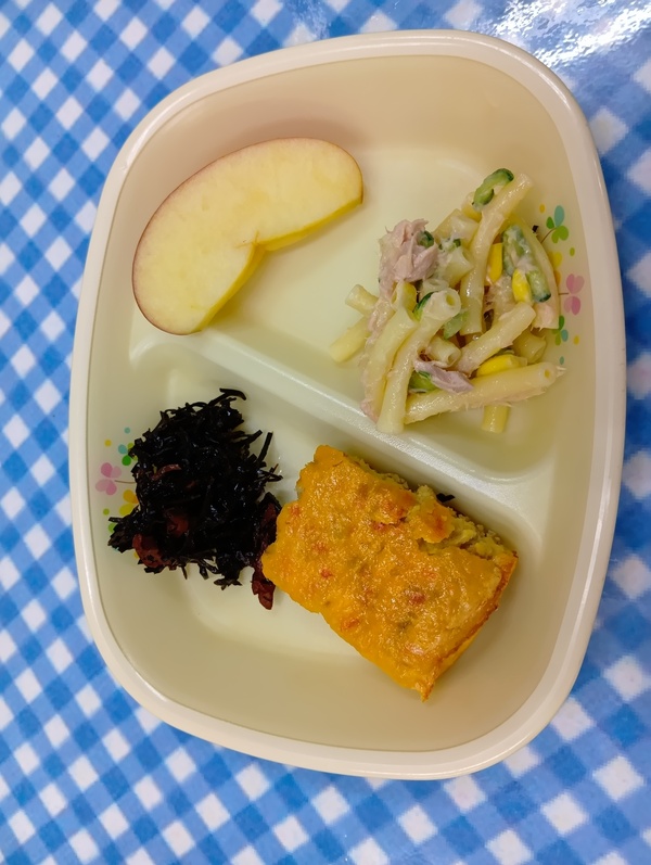 | 給食 厚焼き玉子 マカロニサラダ あらめ煮 りんご おやつ とうふドーナツ |