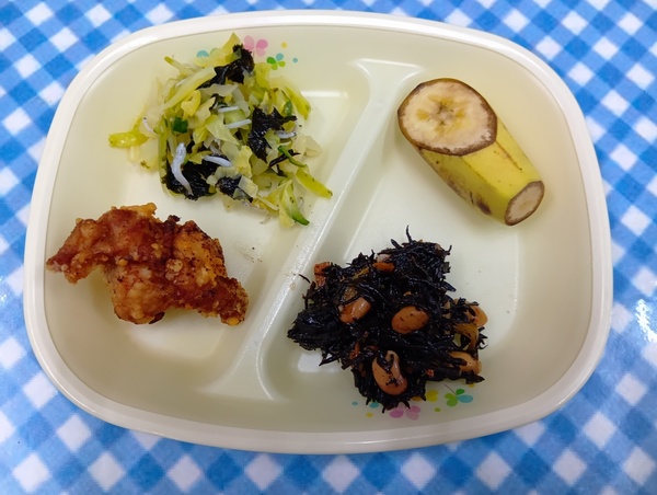 | 給食 鶏のから揚げ キャベツののり酢和え ひじきと大豆煮 バナナ おやつ マーラーカオ |