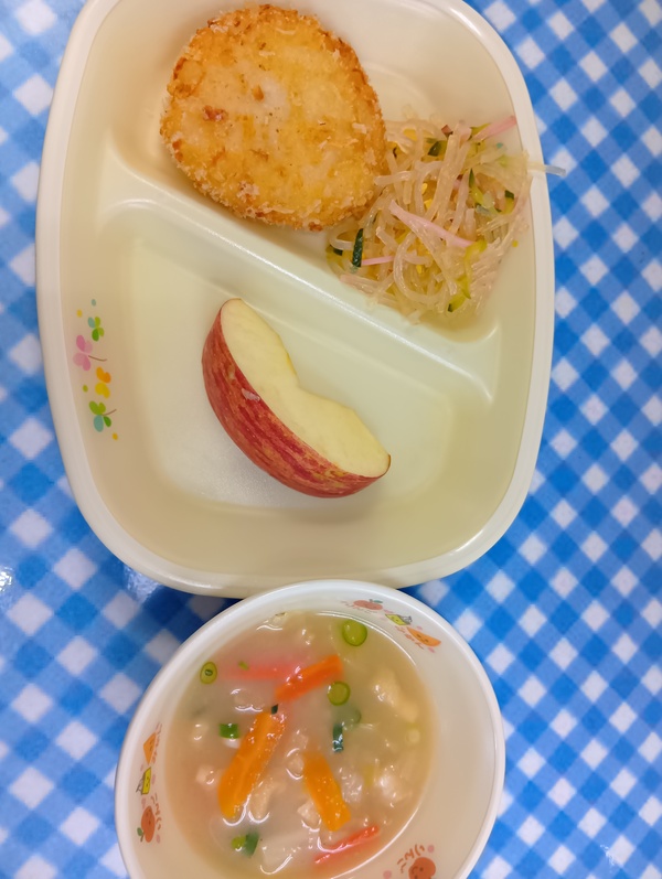 | 給食 はんぺんコロッケ バンサンスー 味噌汁 りんご おやつ あさりのしょうゆバタースパゲティー |