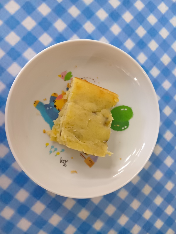 | 給食 鶏肉とさつまいものうま煮 納豆和え キノコ汁 オレンジ おやつ 米粉のバナナケーキ |
