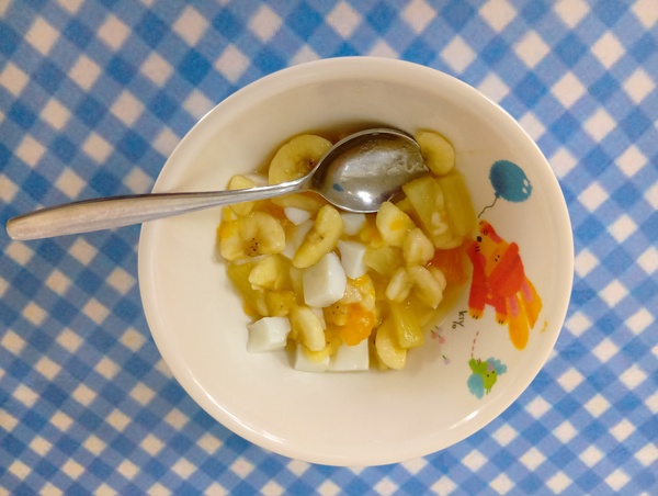 | 給食 魚のマヨネーズ焼き 錦和え イタリアン炒り豆腐 バナナ おやつ キャラメル麩 |