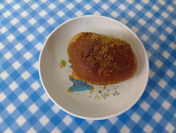 | 給食 お豆ハンバーグ けんちょう 豆乳スープ みかん おやつ プリン蒸しパン |