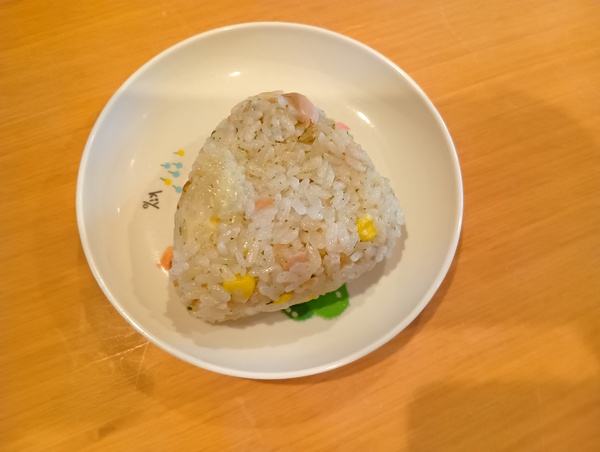 | 給食 魚の竜田揚げ 春雨サラダ ほうれん草と卵のケチャップ炒め りんご おやつ ツナコーンおにぎり |