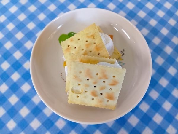 | 給食 鮭入り豆乳グラタン 胡瓜とチーズの酢の物 せんべい汁 不知火(オレンジ) おやつ スモア |
