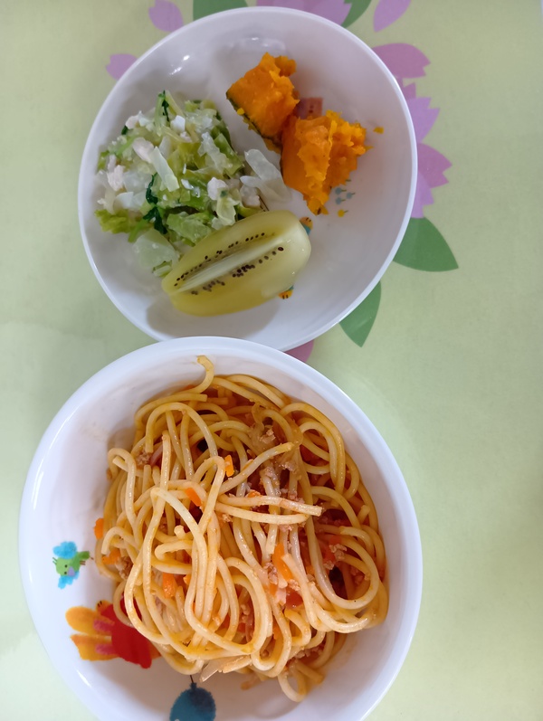 | 給食 チキンチキンゴボウ 五目ひじき かぶとサツマイモの味噌汁 バナナ おやつ あさりとほうれん草のバター醤油パスタ |