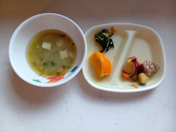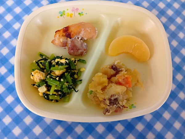 給食 鶏肉の塩こうじ焼き 小松菜とチーズのサラダ 肉じゃが もも缶 おやつ きなこおはぎ |