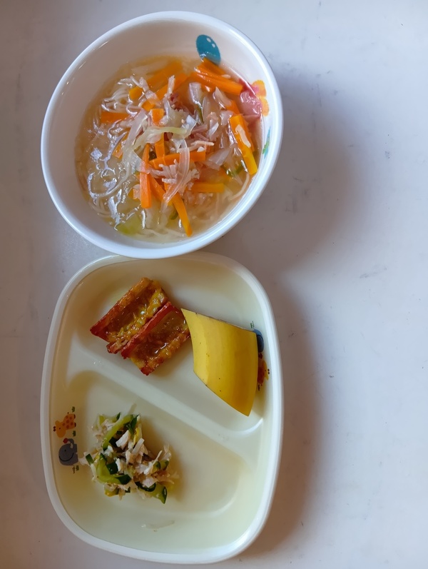 給食 ちくわのカレーマヨネーズ焼き バンバンジー コンソメにゅう麺 バナナ おやつ 黒糖わらび餅 |