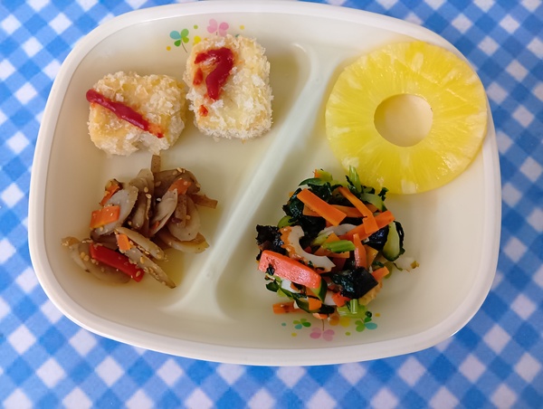 給食 高野豆腐のフライ のりのりコリアンサラダ 五目きんぴら パイン缶 おやつ しらすピザ |