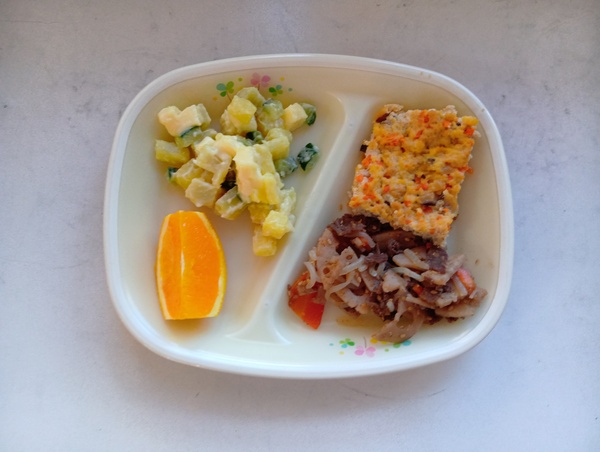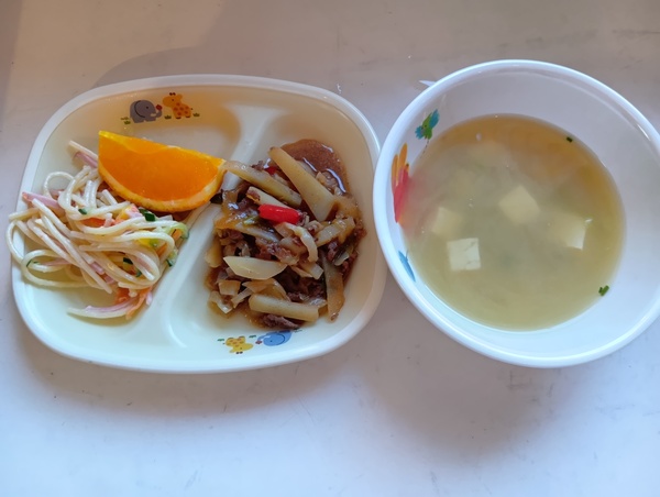 給食 擬製豆腐 さつまいもサラダ れんこんと牛肉の炒め煮 オレンジ おやつ 杏仁豆腐 |