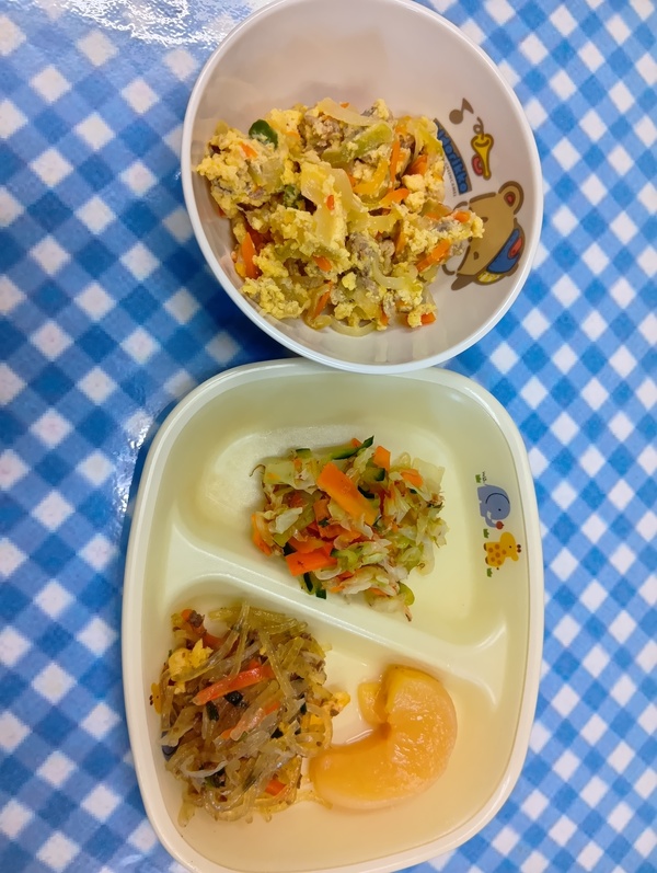 給食 豚肉の卵とじ さっぱりおひたし チャプチェ もも缶 おやつ バームクーヘン |